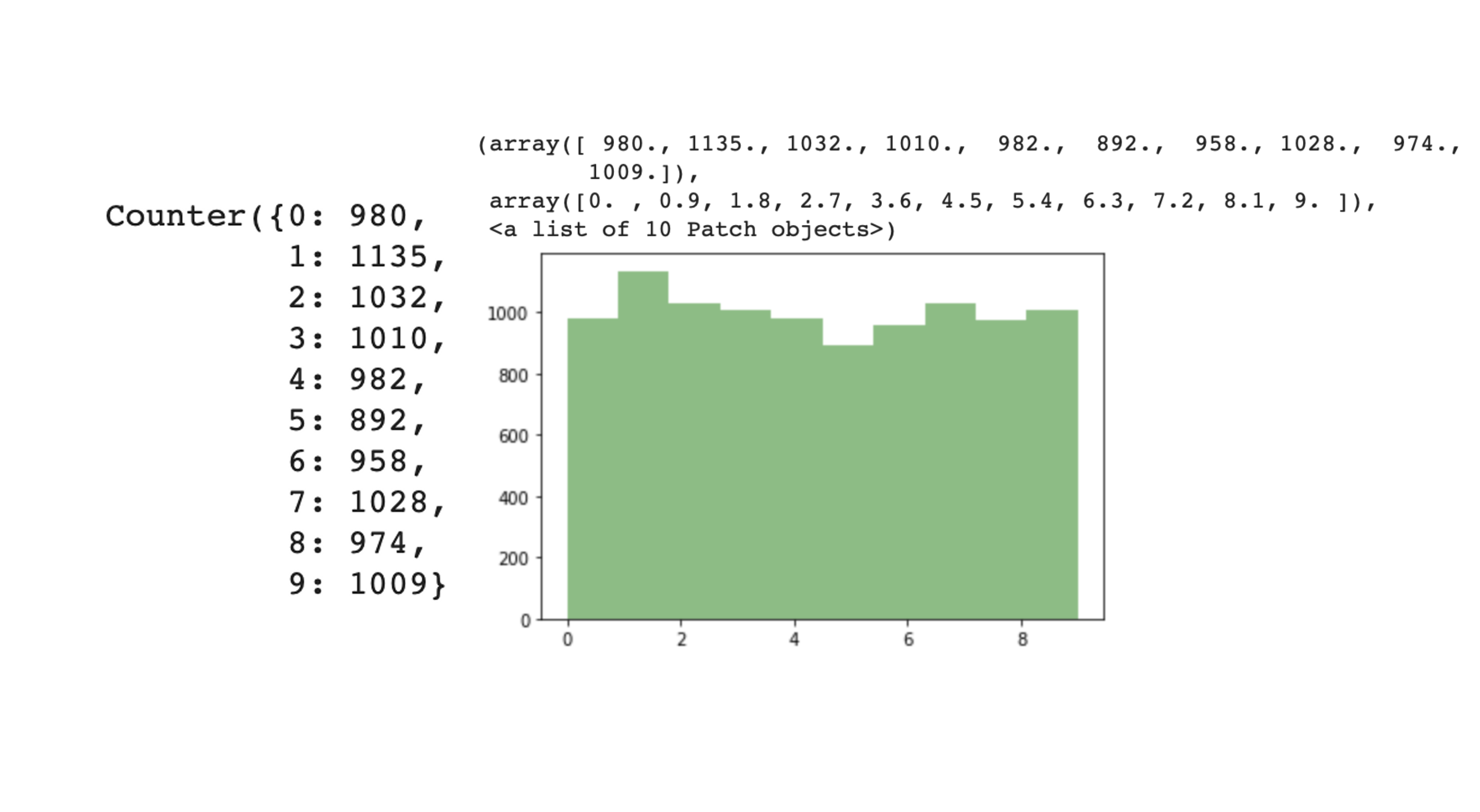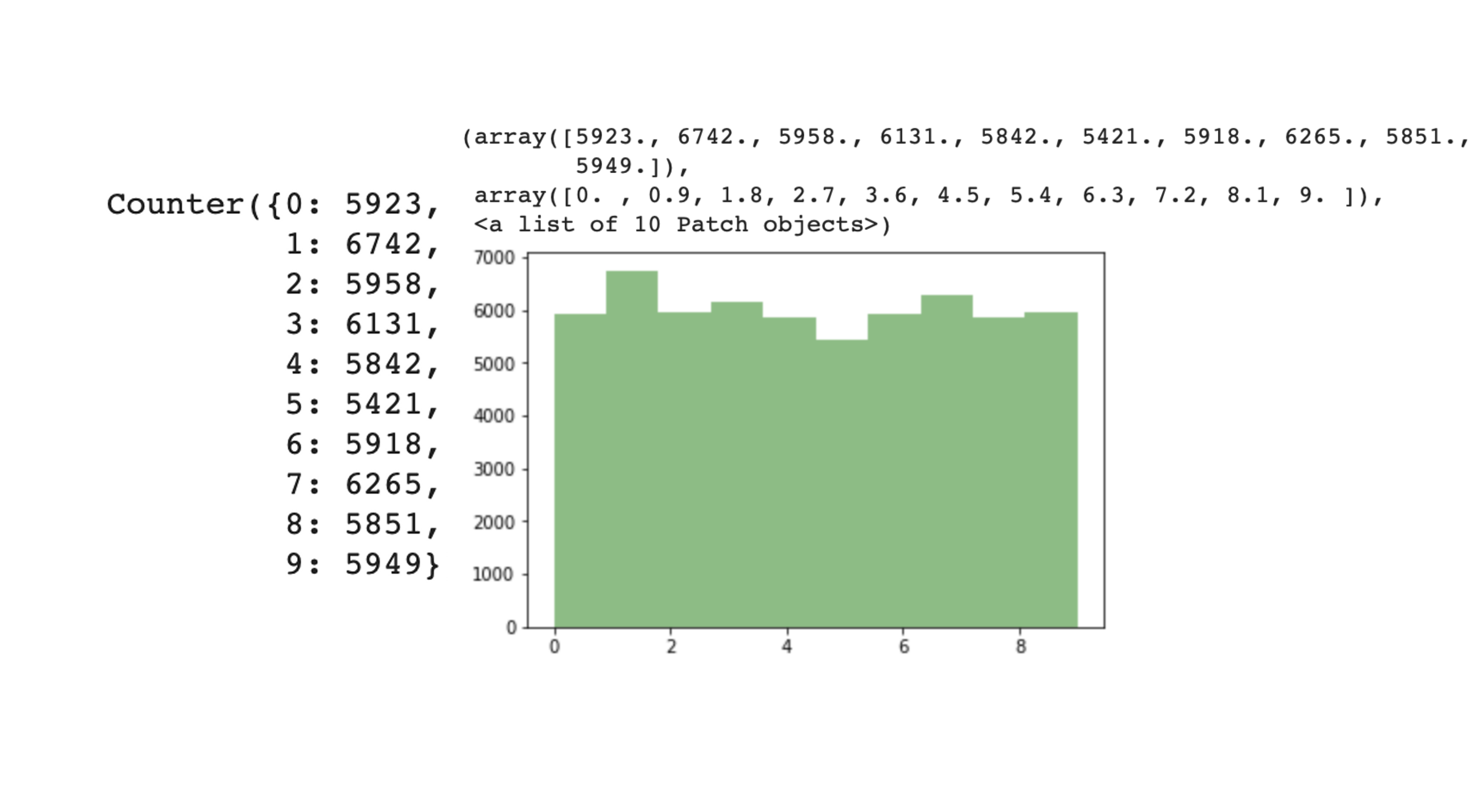 collections์ Counterํจ์๋ฅผ ํตํด label๋ณ๋ก ๋ช๊ฐ์ฉ ์๋์ง ํ์ธํ ์ ์๋ค. Fashion MNIST์๋ ๋ฌ๋ฆฌ ๊ณ ๋ฅด๊ฒ ๋ถํฌ๋์ด์์ง ์๋ค. ๋ณด๊ธฐ์ข๊ฒ matplotlib์ histogram์ ํตํด ์๊ฐํ ํด ๋ณด์๋ค.