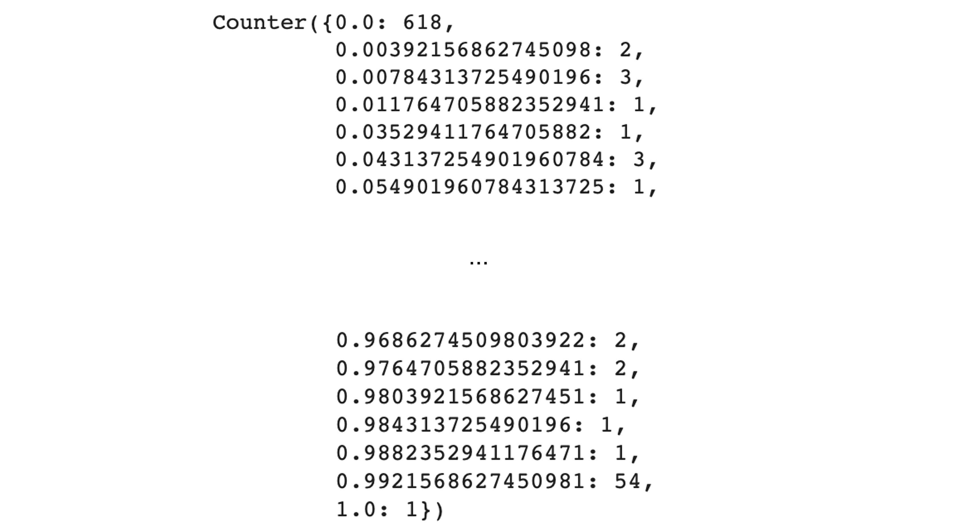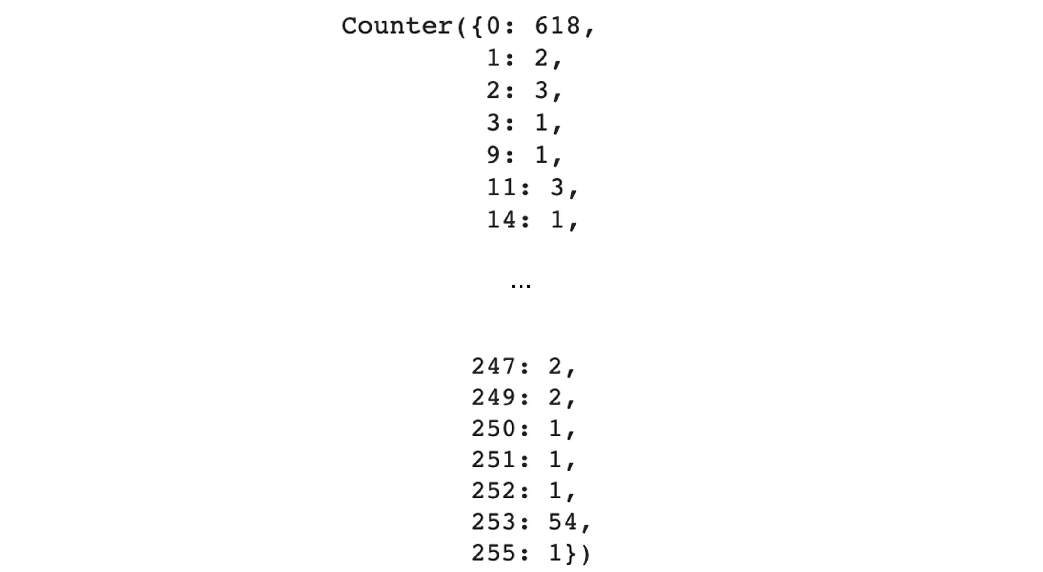 col.Counter(train_images[0].reshape(784)) # 0 ๋ฒ์งธ ์ด๋ฏธ์ง(24*24 2์ฐจ์ ๋ฐฐ์ด)๋ฅผ 784์ฌ์ด์ฆ์ 1์ฐจ์ ๋ฐฐ์ด๋ก reshapeํ์ฌ ์์(์์ ๊ฒฐ์ ํ๋ ์์น)๋ฅผ ํ์ธํด ๋ณด์๋ค.